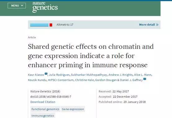 该研究结果以《Shared genetic effects on chromatin and gene expression indicate a role for enhancer priming in immune response》为题发表在1月29日的《Nature Genetics》上。