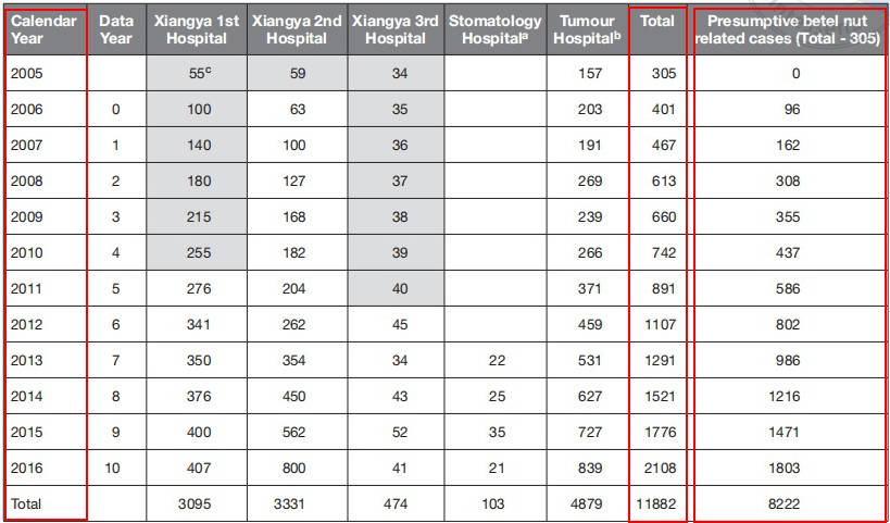 从表格我们可以看到,五所医院收治的口腔癌患者数量每年都在快速上升,其中由于长期咀嚼槟榔导致的口腔癌患者所占的比例也在逐年增高。